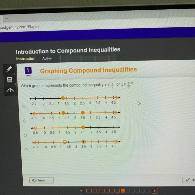 We know that 5/4=1.25. We start at 1.25. Then the inequality tells less than or equal to. Since it is less than, we would travel to the left, where the numbers get smaller and smaller.