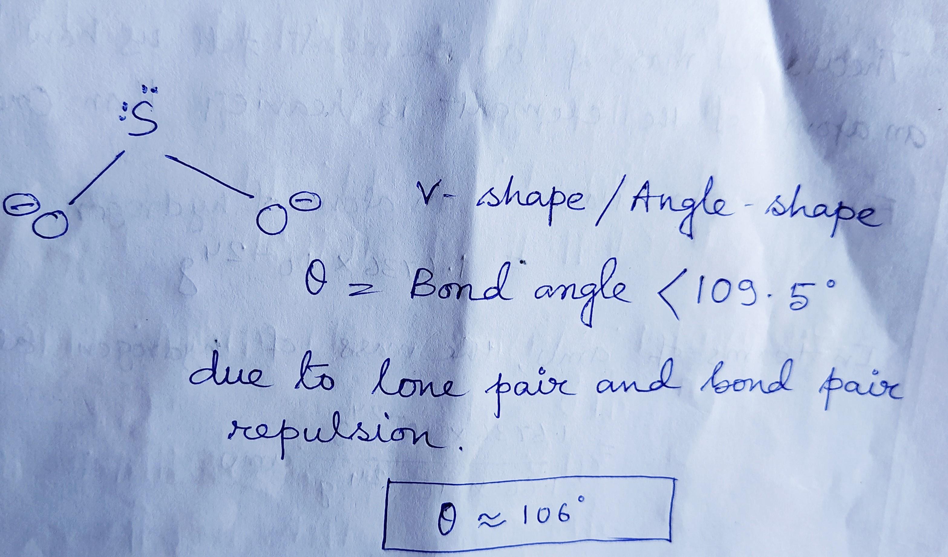 The most reasonable estimate for the O–S–O bond angle in hyposulfite = 106°