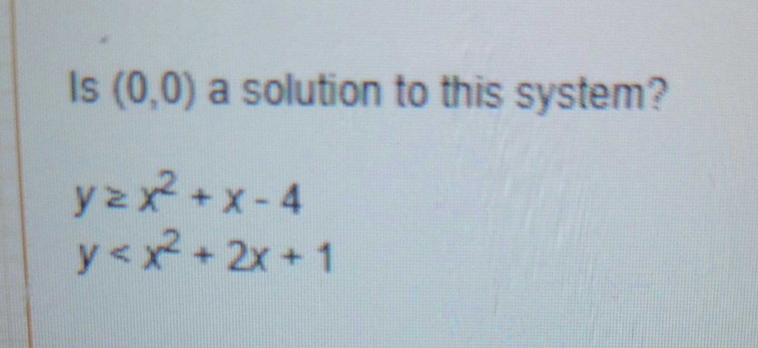 (0,0) is a solution to this system y ≥ x² + x - 4 and y < x² + 2x + 1
