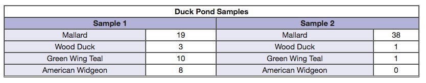 Rhonda manages wildlife samples for Ducks Unlimited. Two samples of duck populations at a migratory site are shown in the table