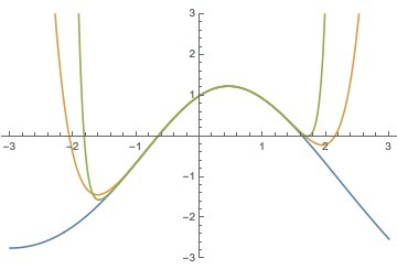 Attached below is a plot of a numerical solution (blue) compared to the first 9 terms and first 21 terms of the series solution over the interval , assuming initial values of .