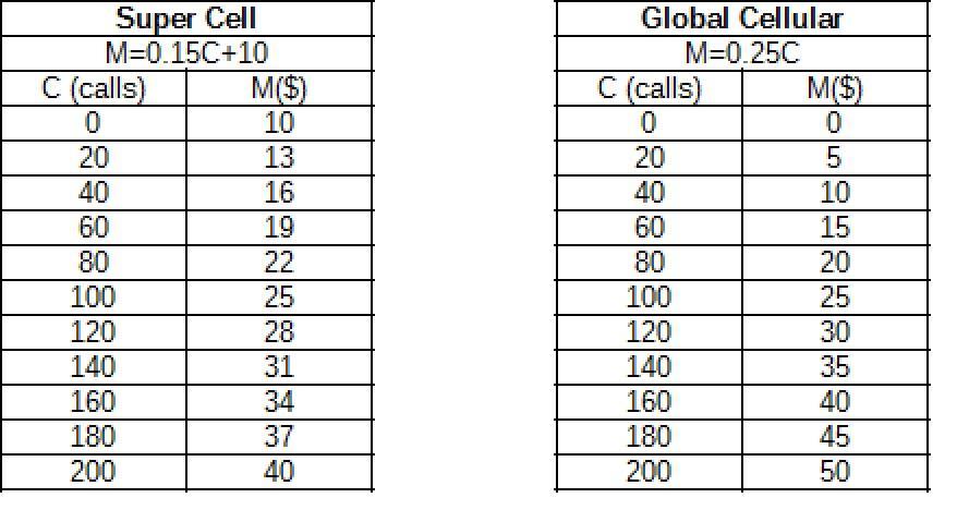c) If Gertrude is going to make less than 100 calls per month the best plan is Global Cellular. On the other hand, if Gertrude is going to make more than 100 calls per month the best option is Super Cell.