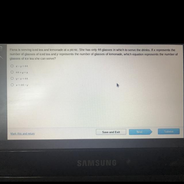 She has 44 glasses.  The number of glasses of lemonade, y, and the number of glasses of ice tea, x,  totals 44