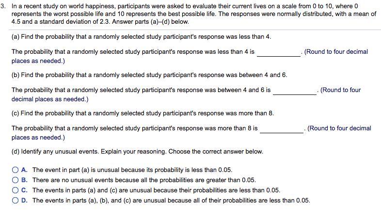 Generally the probability that a randomly selected study participant's response was less than 4 is mathematically represented as