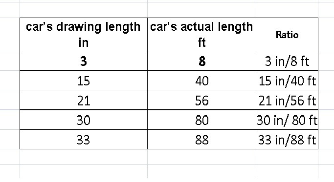 On the scale drawing of a car, the length from bumper to bumper is 6 inches. The car’s actual length, from bumper to bumper, is