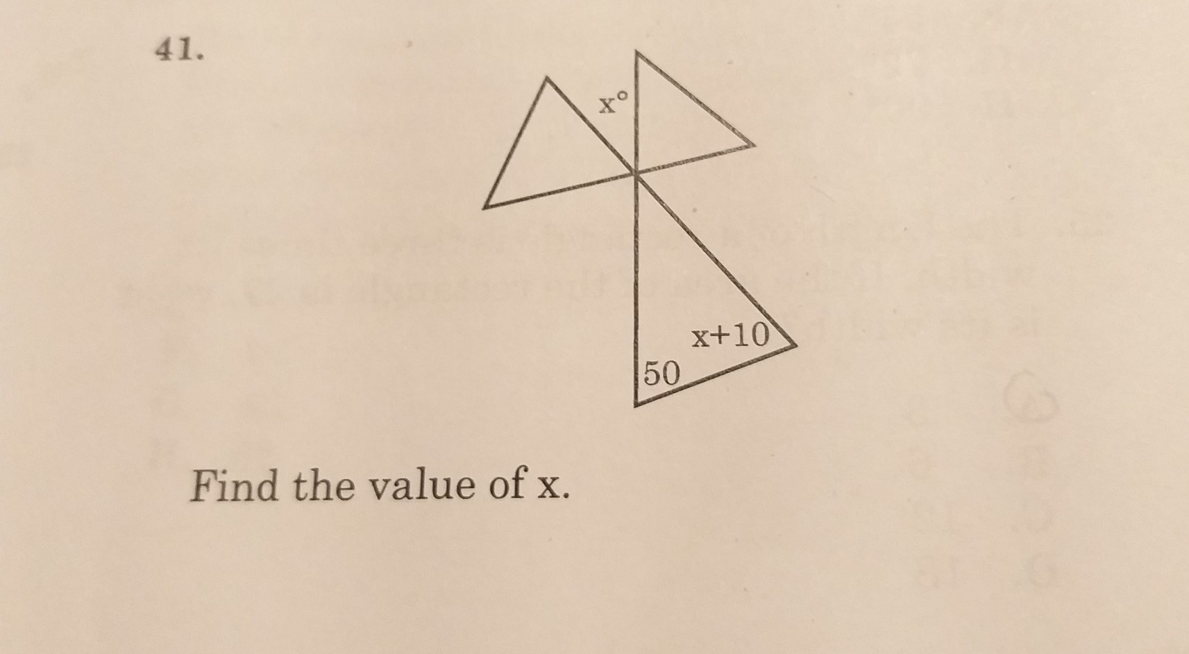 ( x ) + ( 50 ) + ( x + 10 ) = 180°