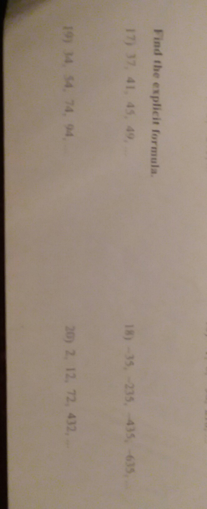 plz help me if it's hard to see I'll type it 17) 37, 41, 45, 49, ... 18) -35, -235, -435, -635,... 19) 34, 54, 74, 94, ... 20) 2