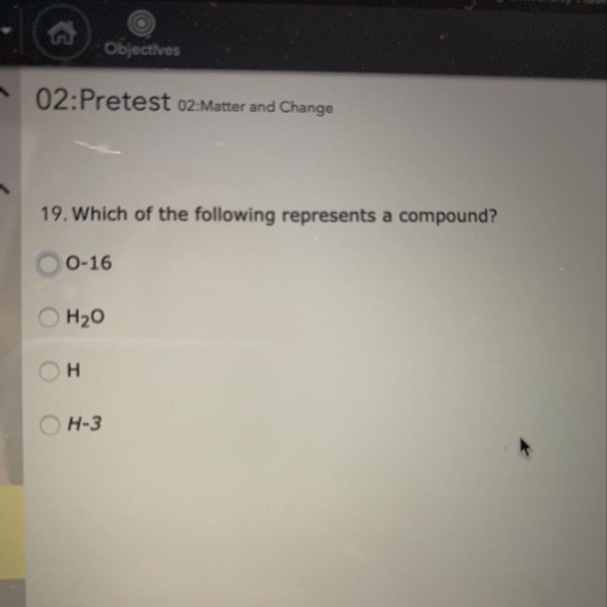Compound consists of combinations of elements. H (Hydrogen) is an element. O-16 and H-3 are stable isotopes of O (Oxygen) and H (Hydrogen), which are elements. H₂O is compound formed by two elements: Hydrogen and Oxygen.
