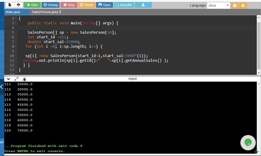 System.out.println(sp[i].getId()+" "+sp[i].getAnnualSales() ); } } } /*uses object sp of class SalesPerson to access the methods getId which returns the id and getAnnualSales method which returns the annual sales, to display id and annual sales */
