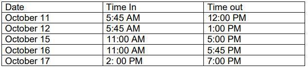 October 12, He worked from 5:45 - 1:00pm = 7 hours 15 mins = 71.75