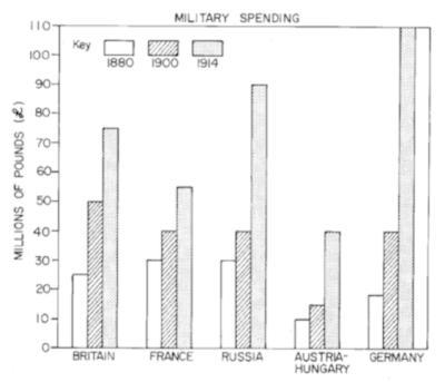 The chart below lists military expenditure expenditures between several European nations during the years 1880, 1900 and 1914. This document is of great historical importance, and may even help us to draw some conclusions about the directions that Europe took during the first World War.