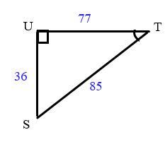 The adjacent side to angle T is 77 and the hypotenuse is 85, thus: