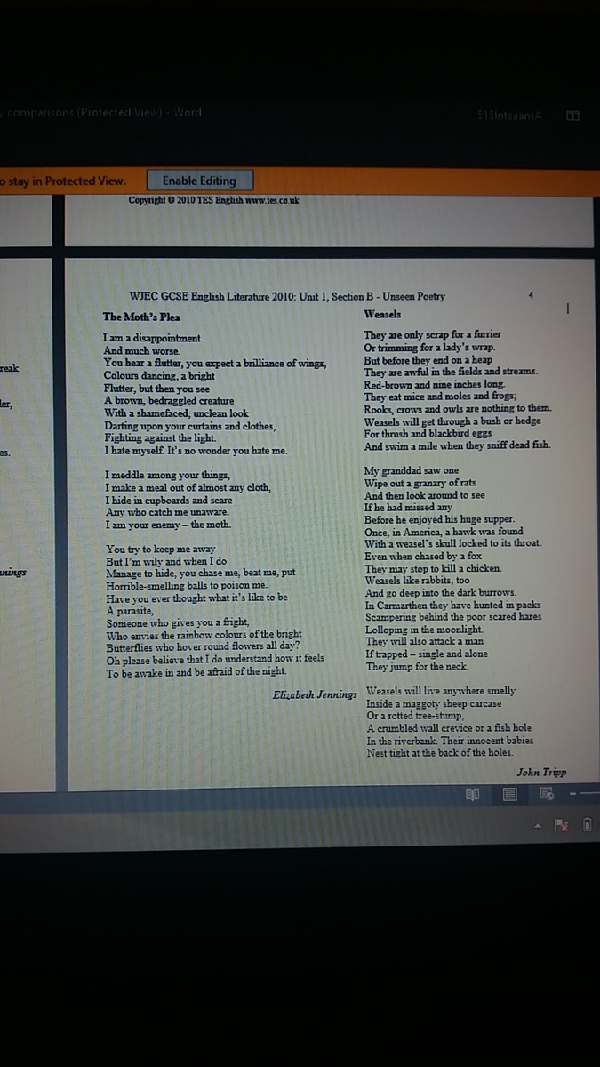I'd say that both are about nuisances. The Moth's Plea, by Elizabeth Jennings, is form the moth's perspective at being a pest, and it is given in a way so that you pity the moth. However, the poem Weasels by John Tripp gives the human's perspective on weasels, which are also pests. It gives every negative aspect about weasels so you come to despise them. In conclusion, the Moth's Plea is about pitying the pest, while Weasels is about shaming and hating on the pest.
