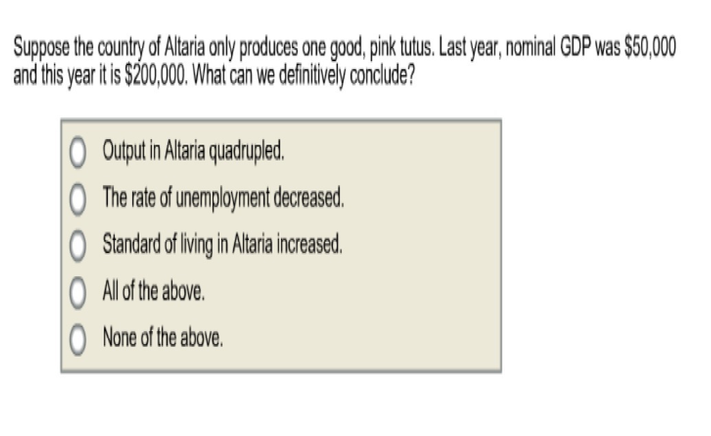 Suppose the country of altaria only produces one good, pink tutus. last year, nominal gdp was $50,000 and this year it is $200,0