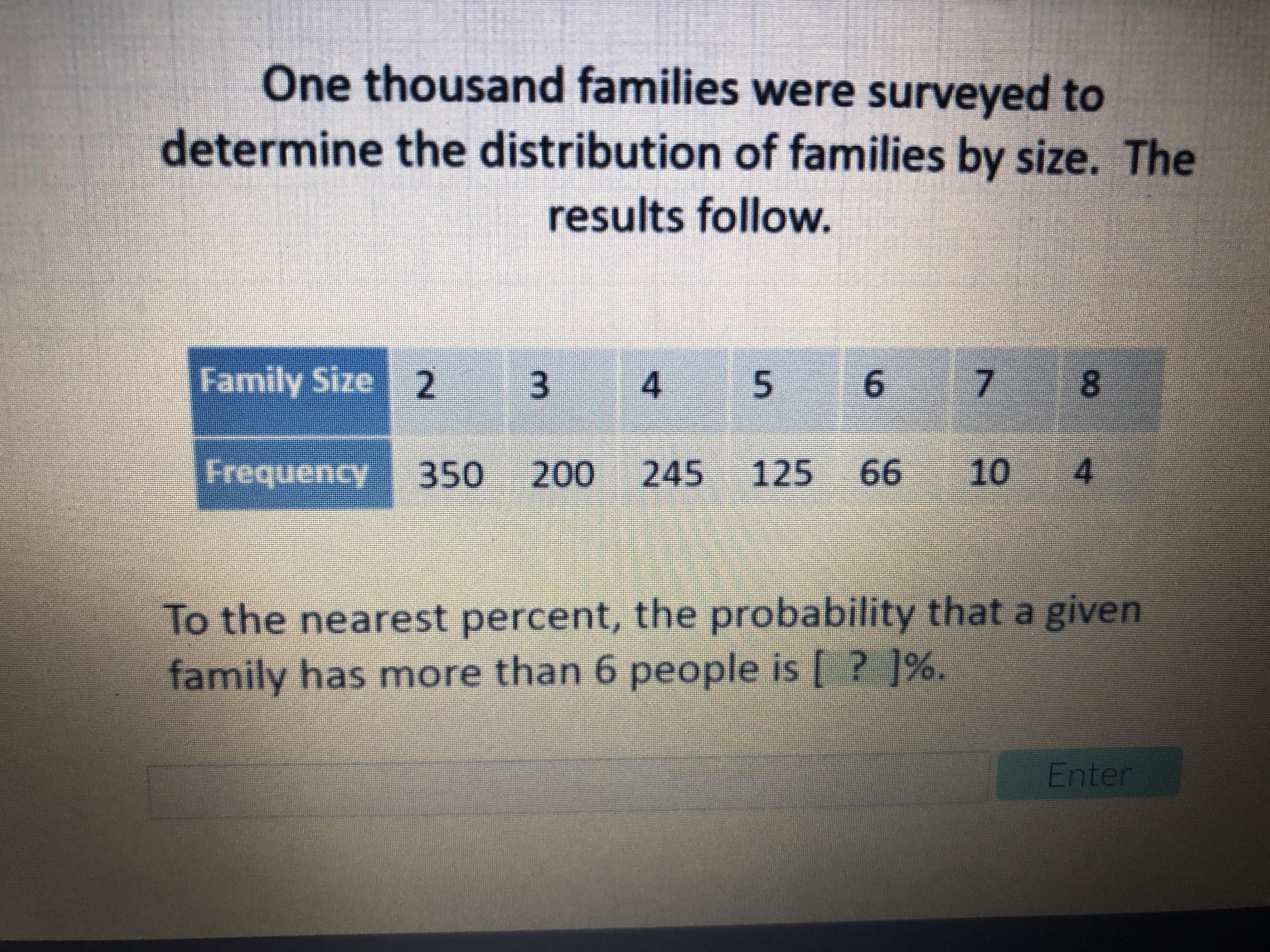 We are to find the probability (in percent) that a given family has more than 6 people.