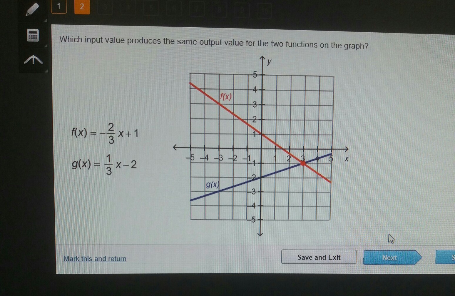 Which imput value produces the same output value for the two functions on the graph?