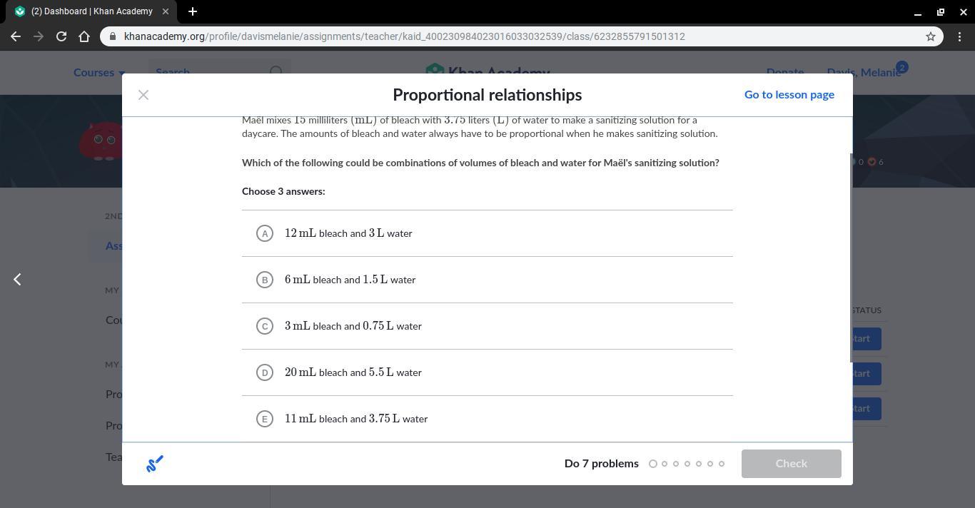 Let us see our given options one by one to find which could be combinations of volumes of bleach and water for Mael's sanitizing solution.