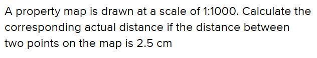 <u>A property map is drawn at a scale of 1:1000. Calculate the corresponding actual distance if the distance between two points on the map is 2.5 cm !</u>