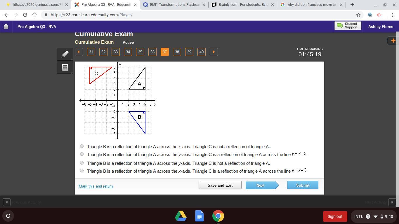 I believe this is the correct answer because Tringle B does reflect Triangle A across the x-axis (----------) and ofcourse Triangle C is not a reflection of A