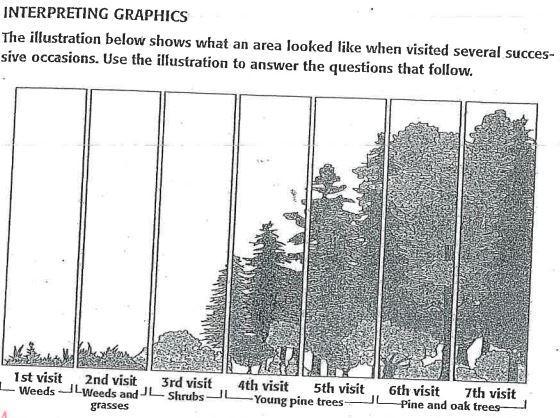 From the ecological (biological) community illustrated in the image attached, we can deduce that there is an evolution (change) in the species of plants growing over time. This ranges from weeds during the first visit to pine and oak trees during the seventh visit.