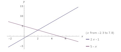 2x - 1 = -x + 5   =>                  (add "x" to each side)