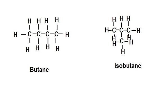 Straight-chained butane is the first structure. The y-chained isobutane is the second structure.