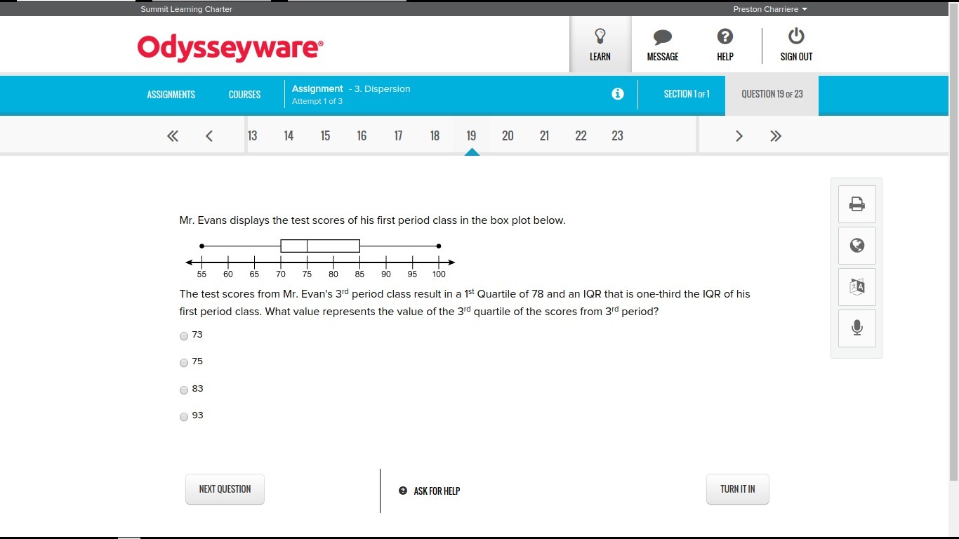 Mr. Evans displays the test scores of his first period class in the box plot below.