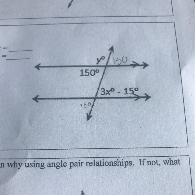 These are vertical angles and if one side is 150 degrees then the other is also 150 degrees so 3x-15=150 so the answer is x =55
