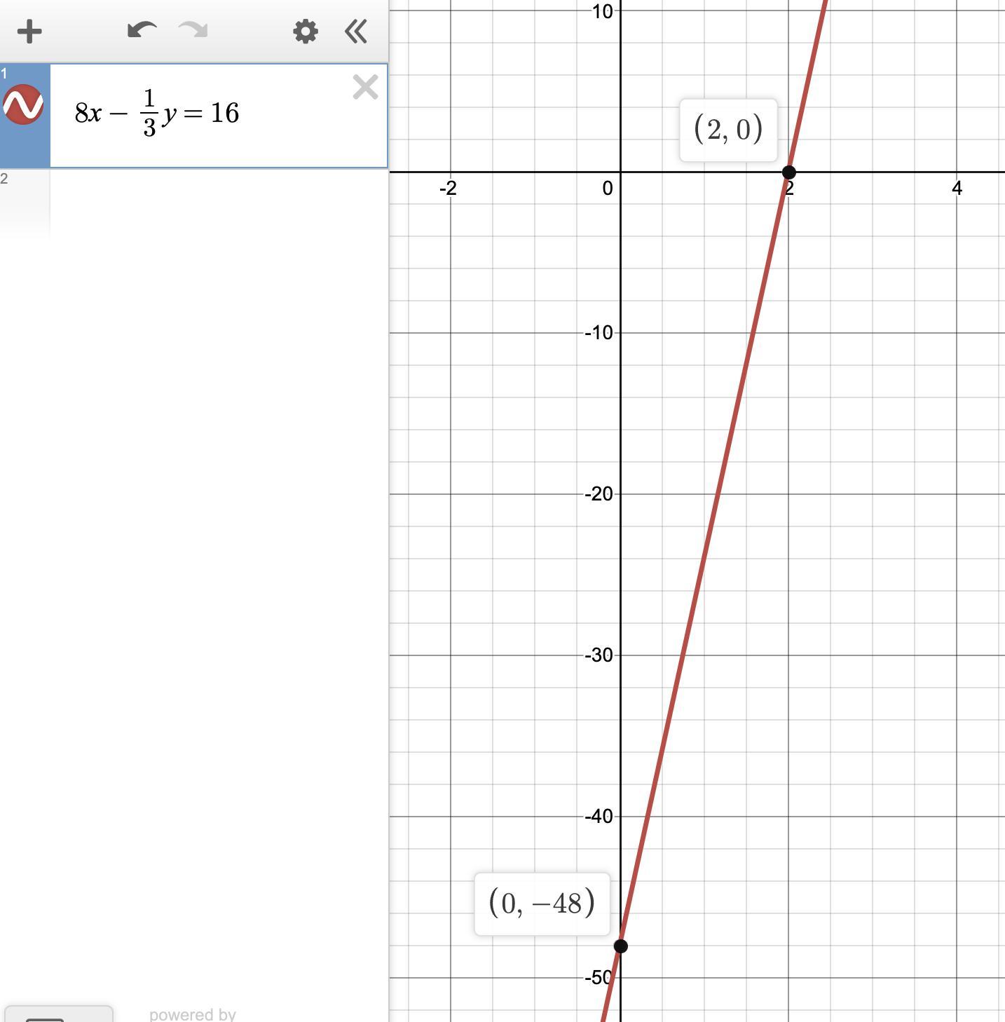 As you can see, the x-intercept is the ratio of the constant to the x-coefficient. The same is true for the y-intercept. It is 16/(-1/3) = -48.
