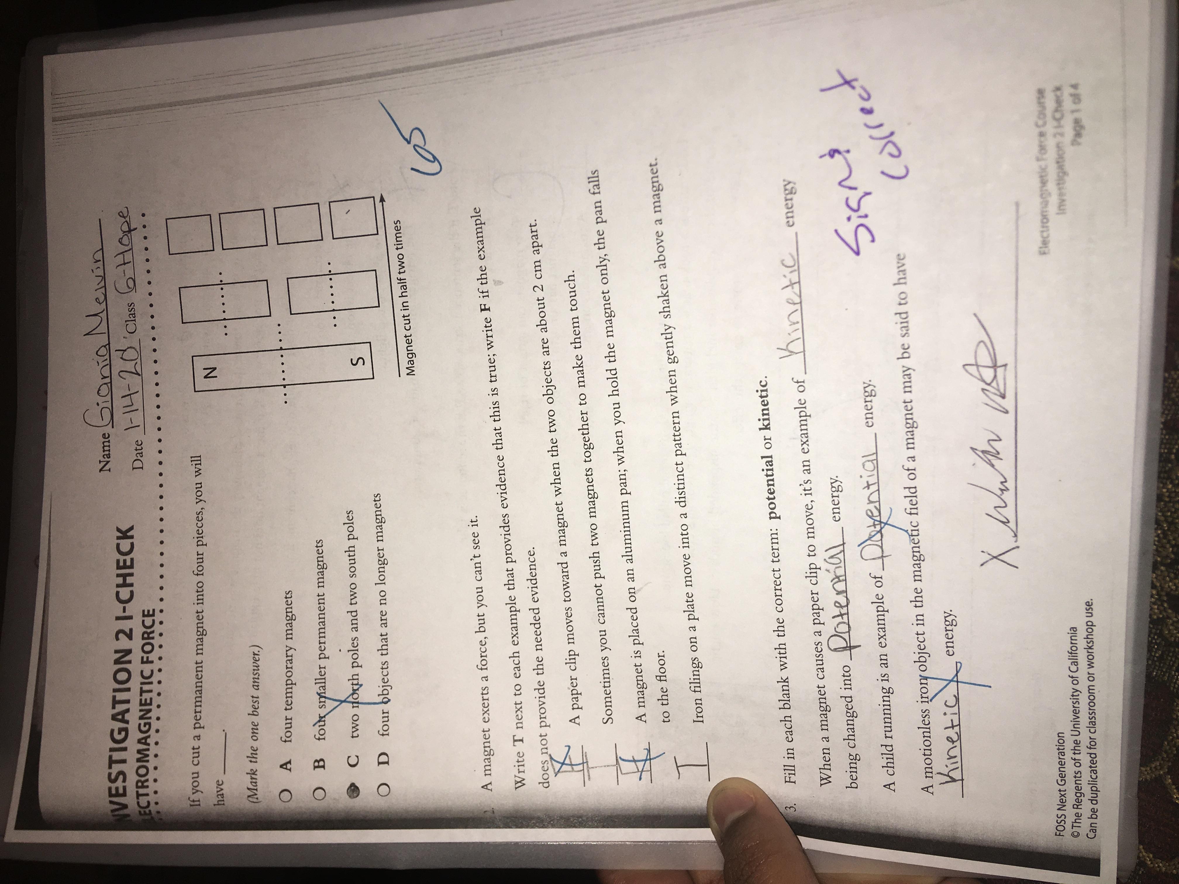 For the true or false, if it is not true than it is false and vis versa. The multiple choice, if you were to cut a magnet, you would have to magnets, each with a north pole and a south pole. If you were to cut those two magnets again, you would have four magnets, each with a north pole and a south pole. The fill in the blank is just like the true or false, if it is not one, then it is the other one.