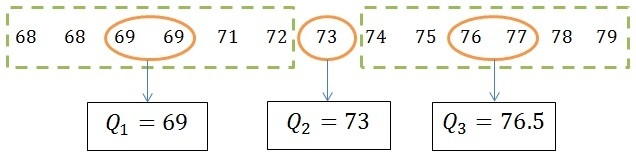 Interquartile range = Q₃ - Q₁ = 76.5 - 69 = 7.5