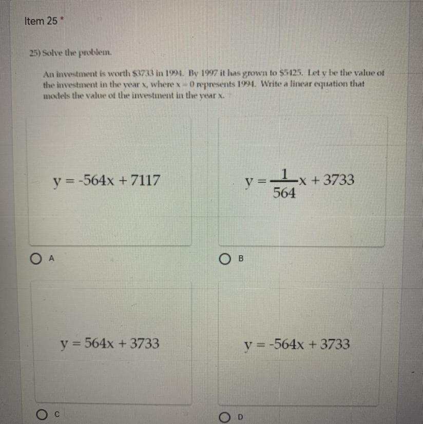 For this case we want to create a linear function for the the value of the investment in the vear x, where x =0 represents 1994.