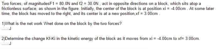 So, in the similar problem that I found, two opposite forces are acting on a block along the frictionless surface. F1 = +80 N and F2 = -30 N.