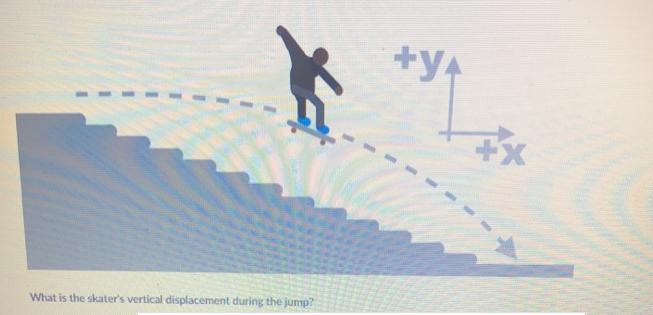 A skateboarder jumps horizontally off the top of a staircase at a speed of 14.5 and lands at bottom of the stairs. The staircase has a horizontal length of 8.00 m. We can ignore air resistance. What is the skater's vertical displacement during the jump?