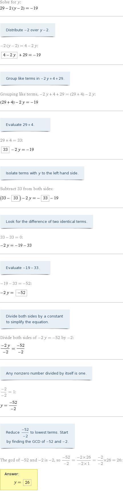 </span></span>Step 2: Subtract 33 from both sides.<span><span><span><span>−<span>2y</span></span>+33</span>−33</span>=<span><span>−19</span>−33</span></span><span><span>−<span>2y</span></span>=<span>−52