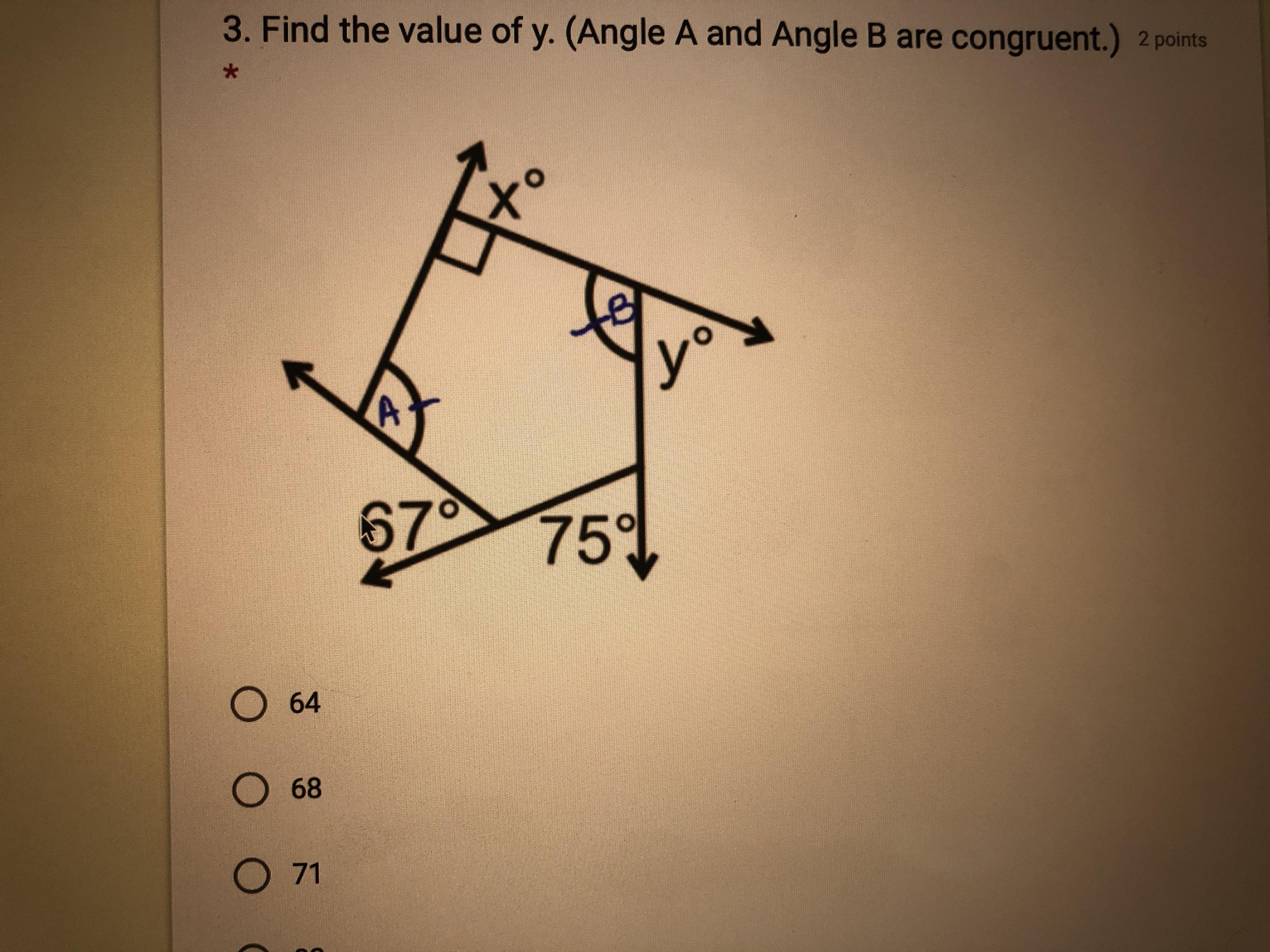 # Angle of measure 75 , angle of measure 67 , y° , y° , x°