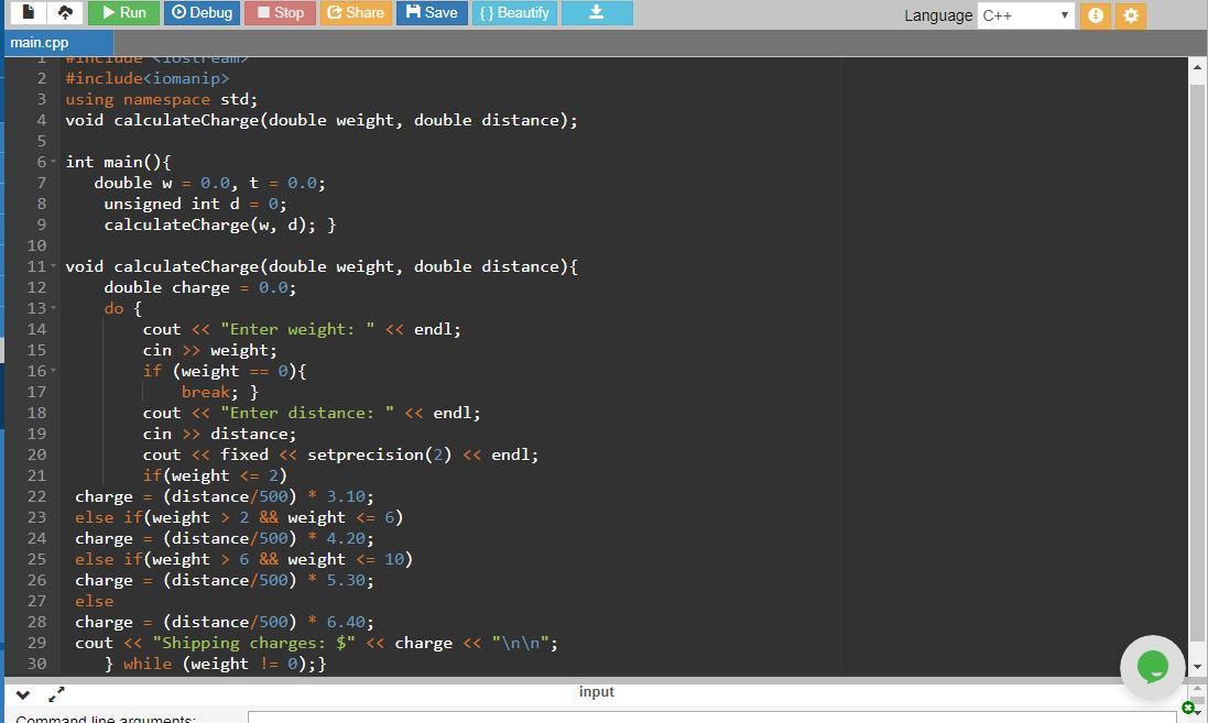 The program is explained in the comments mentioned above. The program has a main() function that declares variable for weight, distance and total and then calls calculateCharge() method passing weight and dsitance in order to compute and return the shipping charge.