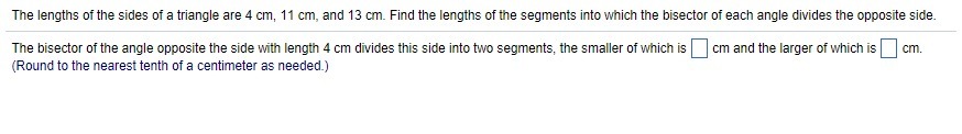 The angle bisector divides the opposite side into segments proportional to the sides of the triangle. side of length 4 is divided into segments 11 : 13. One is 4*11/24 = 11/6, the other 13/6. side of length 11 is divided into segments 4 : 13. One is 11*4/17 = 44/17, the other is 11*13/17 = 143/17 side of length 13 is divided into segments 4 : 11. One is 13*4/15 = 52/15, the other is 13*11/15 = 143/15