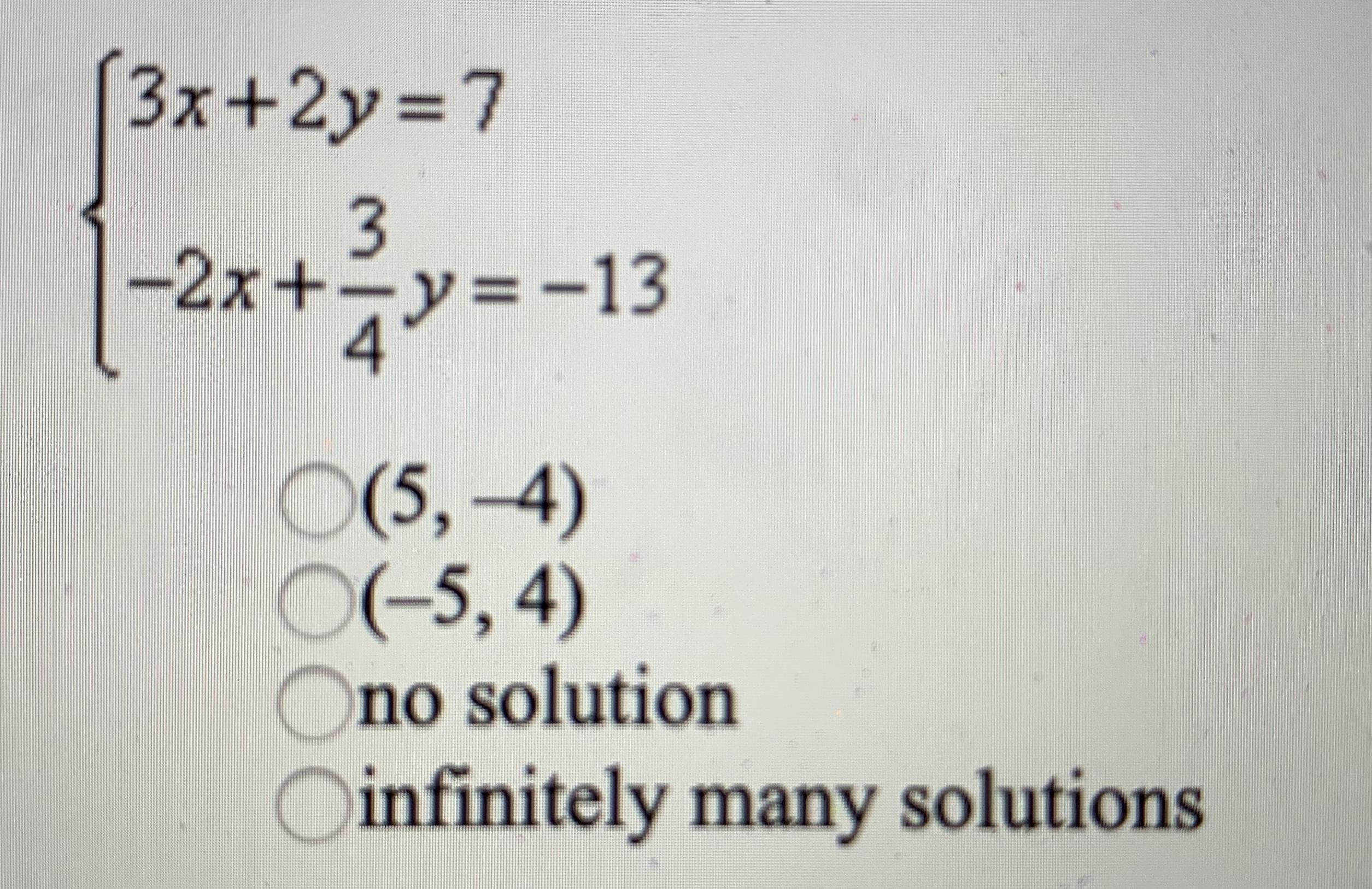 \text{Howdy!}\\\\\text{Make the x variables the same:}\\\\2(3x+2y=7)\\\\3(-2x+3/4y=-13)\\\\\\6x+4y=12\\\\-6x+2.25y=-39\\\\6.25y=-25\\\\y=-4\\\\\text{Now, plug -4 into one of the equations "y" variable}\\\\3x+2(-4)=7\\\\3x-8=7\\\\3x=15\\\\x=5\\\\\boxed{\text{Answer: (5, -4)}}