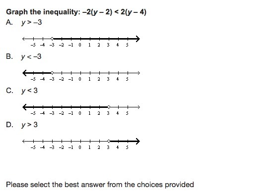 D. y>3 Since 12 does not contain the variable to solve for, move it to the right side of the inequality by subtracting 12 from both sides -4y<-12 Divide each term by -4 and simplify y>3