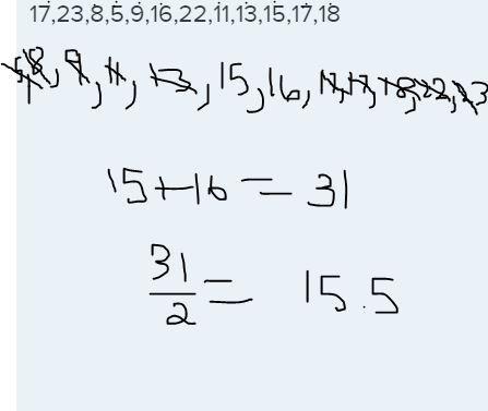 arrange all numbers least to greatest and cross out each number until u get to the last two, once u get to the last two add them and divide them by two: