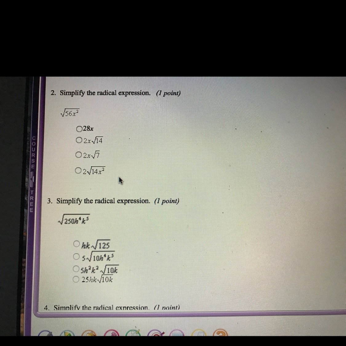 Sqrt(56x^2) = x*sqrt(56) = x*sqrt(4*14) = x* sqrt(4) * sqrt(14)
