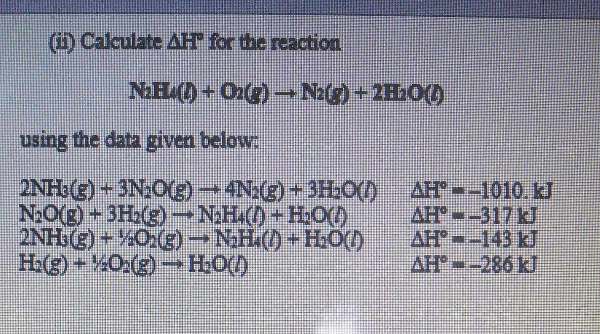 <u>      - 3N2O   - 9 H2     ----> - 3N2H4 - 3H2O      - 3ΔH° 2 = 3*317 kJ</u>