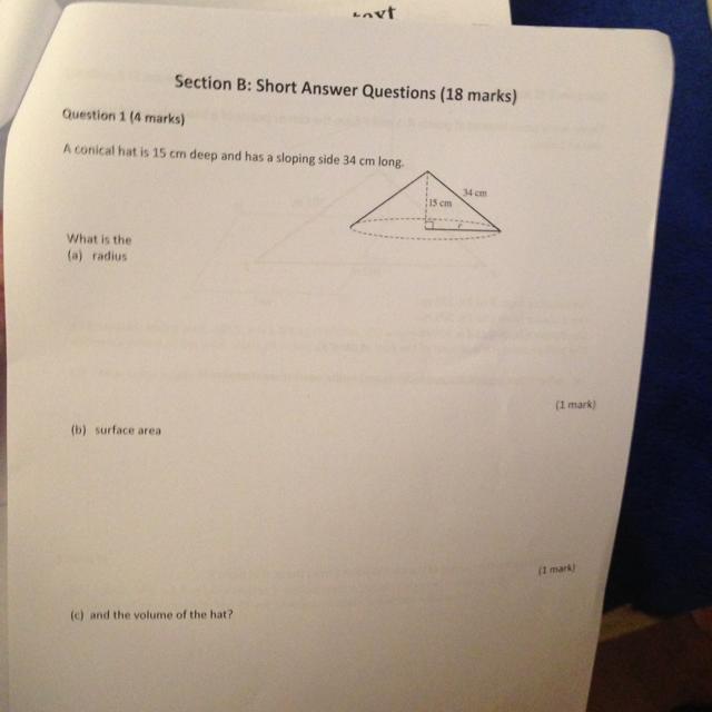 (a) radius is the bottom leg of the right triangle formed by the slopped edge and the vertical line from the tip to the center of the base. So that's easy enough with the pythagorean theorem.