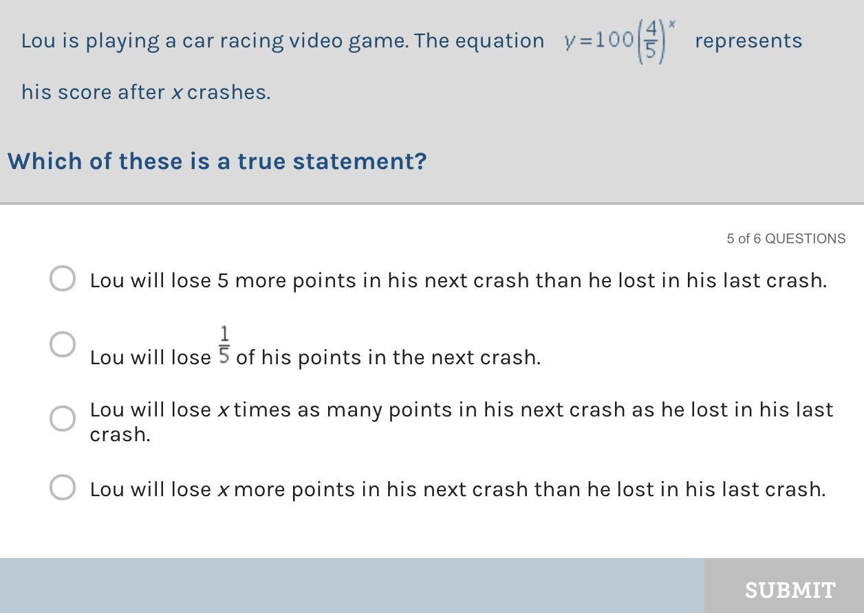 It is the 3rd statement. I got it from process of elimination. The first 2 is incorrect because if Lou crashes once he loses 20 points but if he loses twice he loses 36 points. The last one is incorrect because this is an exponential equation. You don’t add, you multiply.