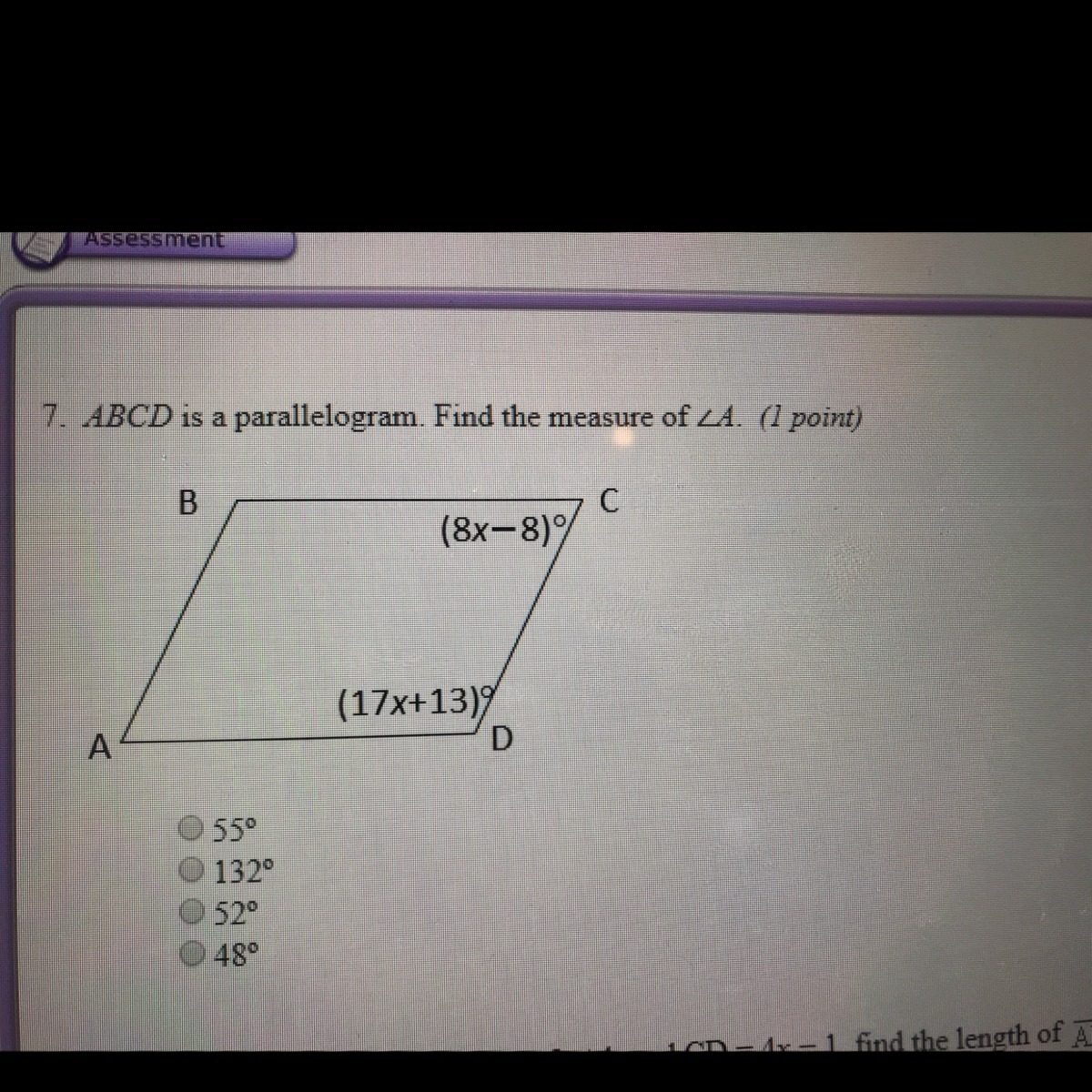 In any parallelogram The sum of interior opposite angles on one side is 180°.