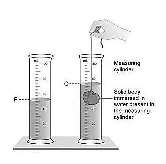 If the object has an irregular shape , the volume can be measured using a displacement can . The displacement can is filled with water above a narrow spout and allowed to drain until the water is level with the spout. As the irregular object is lowered into the displacement can, the water level rises.