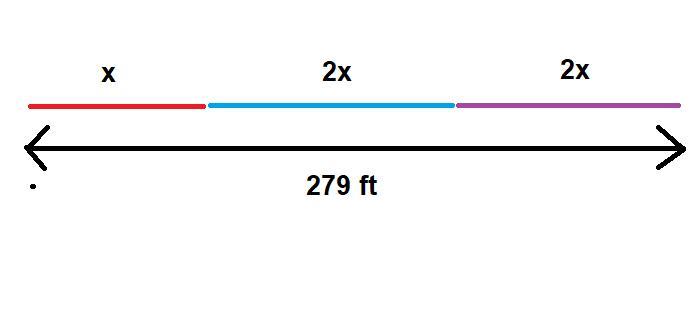 From the question we can see that the total length of the rope is 279 ft and as mentioned it is cut into three pieces. Since the first piece has no length we can give it a variable of x . Piece two is twice as long as piece one, so we can give it a value of 2x . Lastly, piece three is the same as piece two, so it would also be 2x.