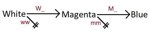 - W_mm = magenta flowers, because the <em>W</em> allele can turn white pigment into magenta, but the mm genotype can't produce a functional protein and the magenta pigment can't turn into the blue one.