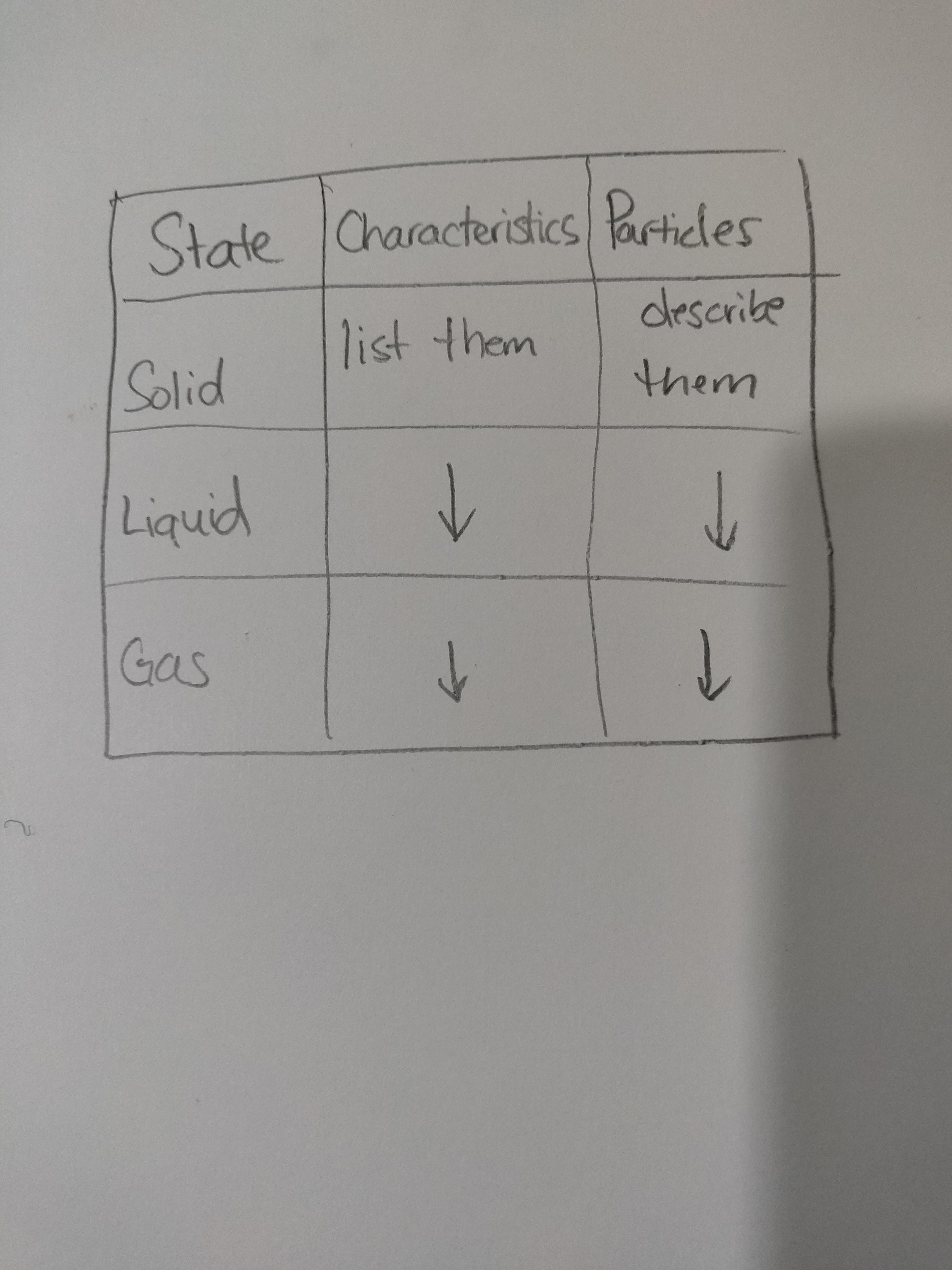 Answer:make a table with solid, liquid, and gas